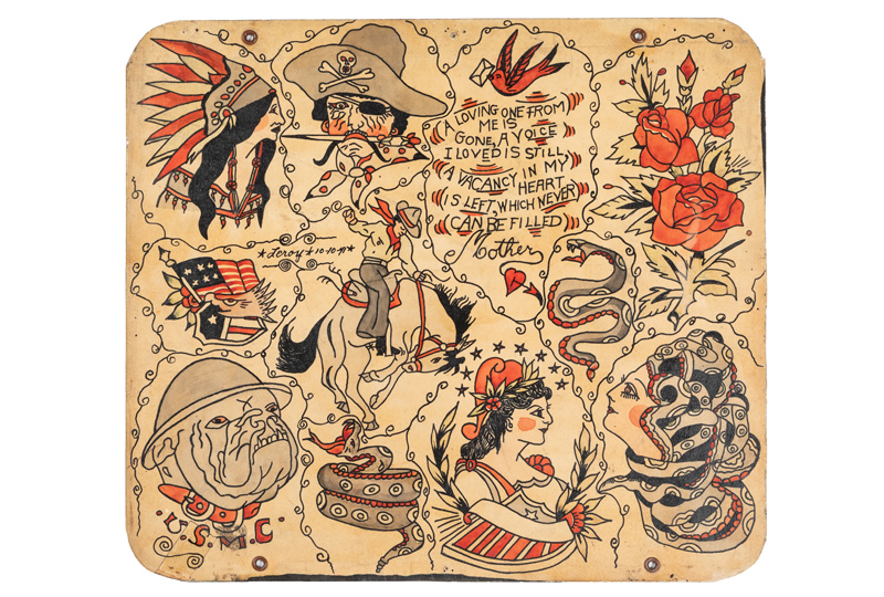 Our Contemporary, Fine, Folk, and Outsider Art sale features works from all time periods and categories. The sale includes 22 lots by the well-known Outsider artist Purvis Young. Other Outsider works include major works by Lee Godie with attached elements including a photo sewn to canvas with the artist’s hair. The sale continues with lots associated with Charles and Ray Eames, and prints by Jasper Johns, Robert Rauschenberg and Howard Hodgkin. In Fine Art we offer water themed works by Paul Lauritz, a schooner by Howard Sprague and The Rush Gatherer - Kutenai orotone by Edward Curtis. In Folk Art we have two exceptional 20th century examples of tattoo flash, an exceptional wood carved and painted ventriloquist dummy, and two intricate marquetry tables along with much more in all categories.
